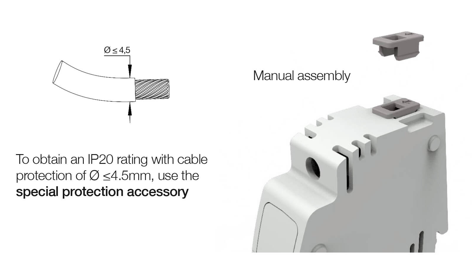 | * To obtain an IP20 rating with cable protection of Ø ≤4.5mm, use the special protection accessory. | |