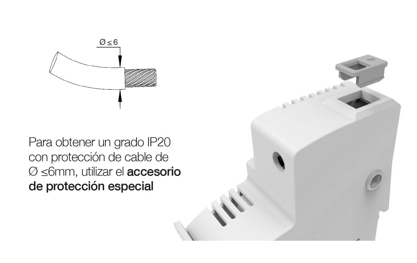 | * Para obtener un grado IP20 con protección de cable de Ø ≤6mm, utilizar el accesorio de protección especial. | |
