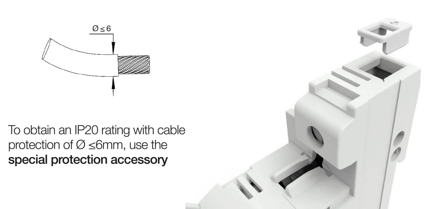 The accessory must be positioned in the wire entries, if it’s necessary to achieve the IP20 degree of protection with thin wires.