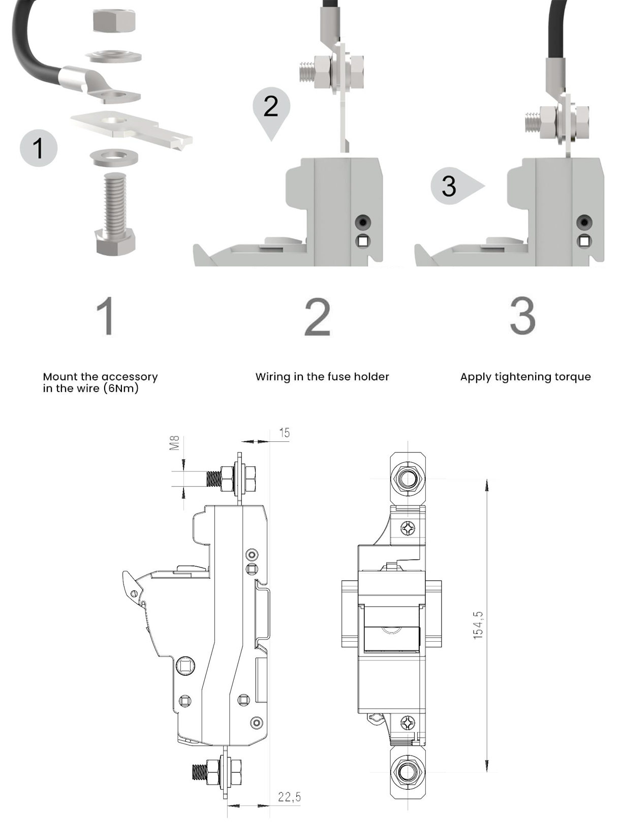 To avoid the operation and connection when the fuse holder is open, put on the accessory “Padlock support” sliding it for the guides, and covering the fuse link zone.