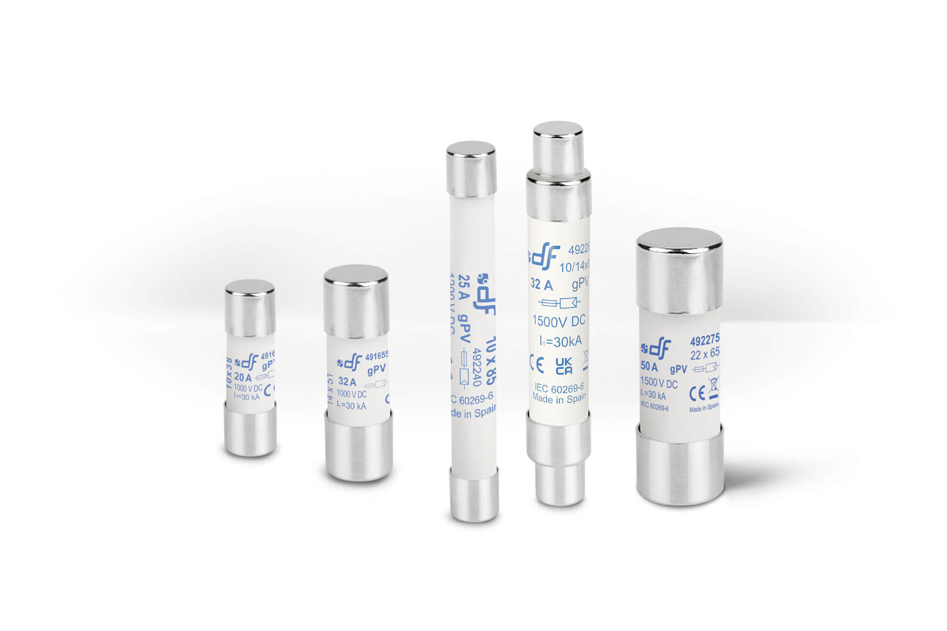 gPV 10×38 and 14×51 cylindrical fuse links have been developed to offer a compact, safety and economic protection of photovoltaic modules (array protection) with voltages up to 1.000/1.100V DC. gPV 10×85, 10/14×85 and 22×65 cylindrical fuse links offer a compact, safety and economic protection of photovoltaic modules (array protection) with voltages up to 1.200/1.500 VDC. They provide protection against overloads as well as short-circuit (gPV class according to the requirements of IEC60269-6 and UL248-19 Standards).