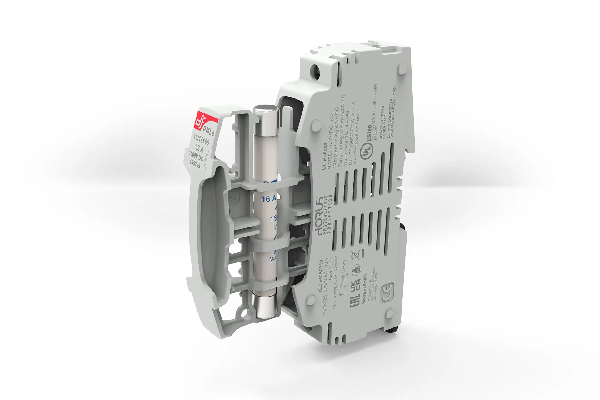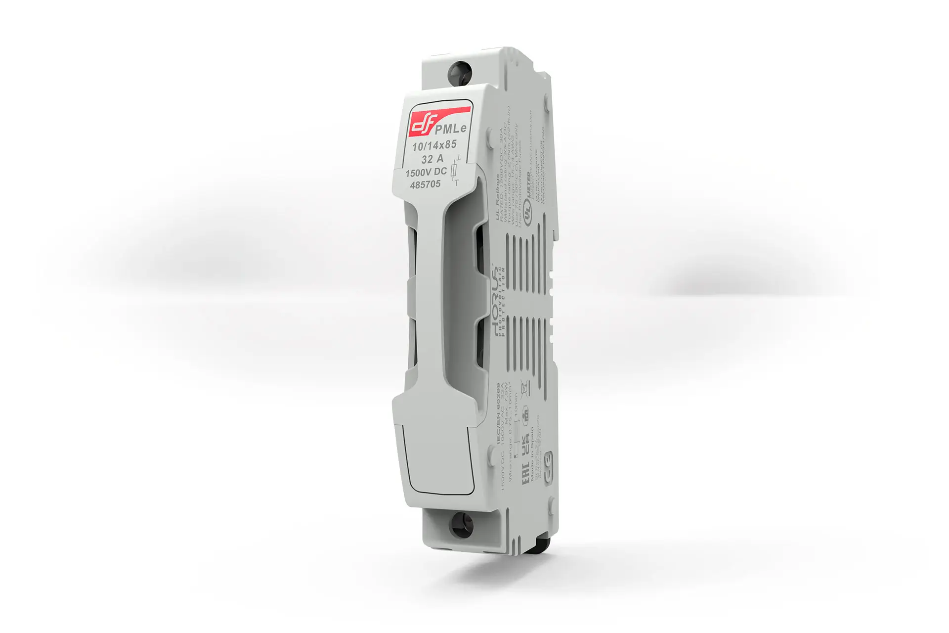 Fuse holder for cylindrical fuse link size 10×85 gVP and 10/14×85 gPV. Modern compact design. Ventilation zones optimized for a better heat dissipation. Manufactured with a high quality materials. Silver plated copper contacts. Plastic materials with high temperature resistance and self-extinguishable. All the materials are according to the European Directive RoHS (Restriction of the use of certain hazardous substances in electrical material) and also halogen free.