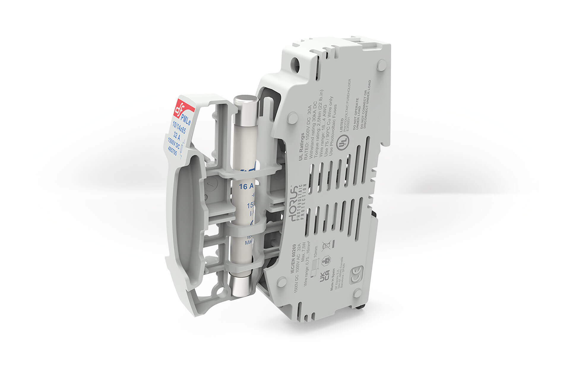 Fuse holder for cylindrical fuse link size 10×85 gVP and 10/14×85 gPV. Modern compact design. Ventilation zones optimized for a better heat dissipation. Manufactured with a high quality materials. Silver plated copper contacts. Plastic materials with high temperature resistance and self-extinguishable. All the materials are according to the European Directive RoHS (Restriction of the use of certain hazardous substances in electrical material) and also halogen free.